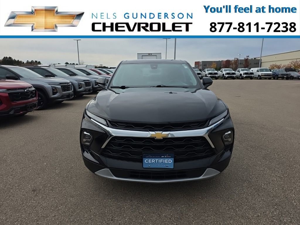 Nels Gunderson Chevrolet is excited to offer this charming 2023 Chevrolet Blazer LT in Black, beautifully equipped with Preferred Equipment Group 2LT, AWD, 170 Amp Alternator, 3.47 Final Drive Axle Ratio, 4-Way Manual Front Passenger Seat Adjuster, 4-Wheel Disc Brakes, 6 Speakers, 6-Speaker Audio System Feature, 8-Way Power Driver Seat Adjuster, ABS brakes, Air Conditioning, Alloy wheels, AM/FM radio: SiriusXM with 360L, Apple CarPlay/Android Auto, Auto High-beam Headlights, Automatic temperature control, Brake assist, Bumpers: body-color, Child-Seat-Sensing Airbag, Compass, Delay-off headlights, Driver door bin, Driver vanity mirror, Dual front impact airbags, Dual front side impact airbags, Electronic Stability Control, Emergency communication system: OnStar and Chevrolet connected services capable, Four wheel independent suspension, Front anti-roll bar, Front Bucket Seats, Front Center Armrest, Front dual zone A/C, Front reading lights, Fully automatic headlights, Heated door mirrors, Illuminated entry, Knee airbag, Leather Shift Knob, Low tire pressure warning, Occupant sensing airbag, Outside temperature display, Overhead airbag, Overhead console, Panic alarm, Passenger door bin, Passenger vanity mirror, Power door mirrors, Power Driver Lumbar Control, Power driver seat, Power steering, Power windows, Premium audio system: Chevrolet Infotainment 3 Plus, Premium Cloth Seat Trim, Radio data system, Radio: Chevrolet Infotainment 3 Plus System, Rear anti-roll bar, Rear reading lights, Rear seat center armrest, Rear window defroster, Rear window wiper, Remote keyless entry, Ride & Handling Suspension, Security system, SiriusXM w/360L, Speed control, Speed-sensing steering, Split folding rear seat, Spoiler, Steering wheel mounted audio controls, Tachometer, Telescoping steering wheel, Tilt steering wheel, Traction control, Trip computer, Variably intermittent wipers, Voltmeter, and Wheels: 18 Grazen Metallic Aluminum. AWD. 22/27 City/Highway MPG2023 Chevrolet Blazer LT You'll Feel at Home!! www.osseoauto.com.